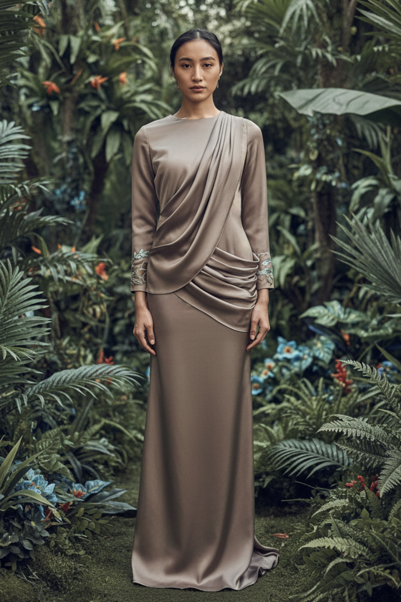“A modern Raya Lux silhouette inspired by the fluid movement and refined craftsmanship of the Silk Road. Soft draping flows across the shoulder and waist, creating a graceful, sculpted form. Intricate embroidery detailing elevates the design, while the use of heavy satin enhances its luxurious drape and luminous finish—an understated statement of contemporary Raya elegance.”