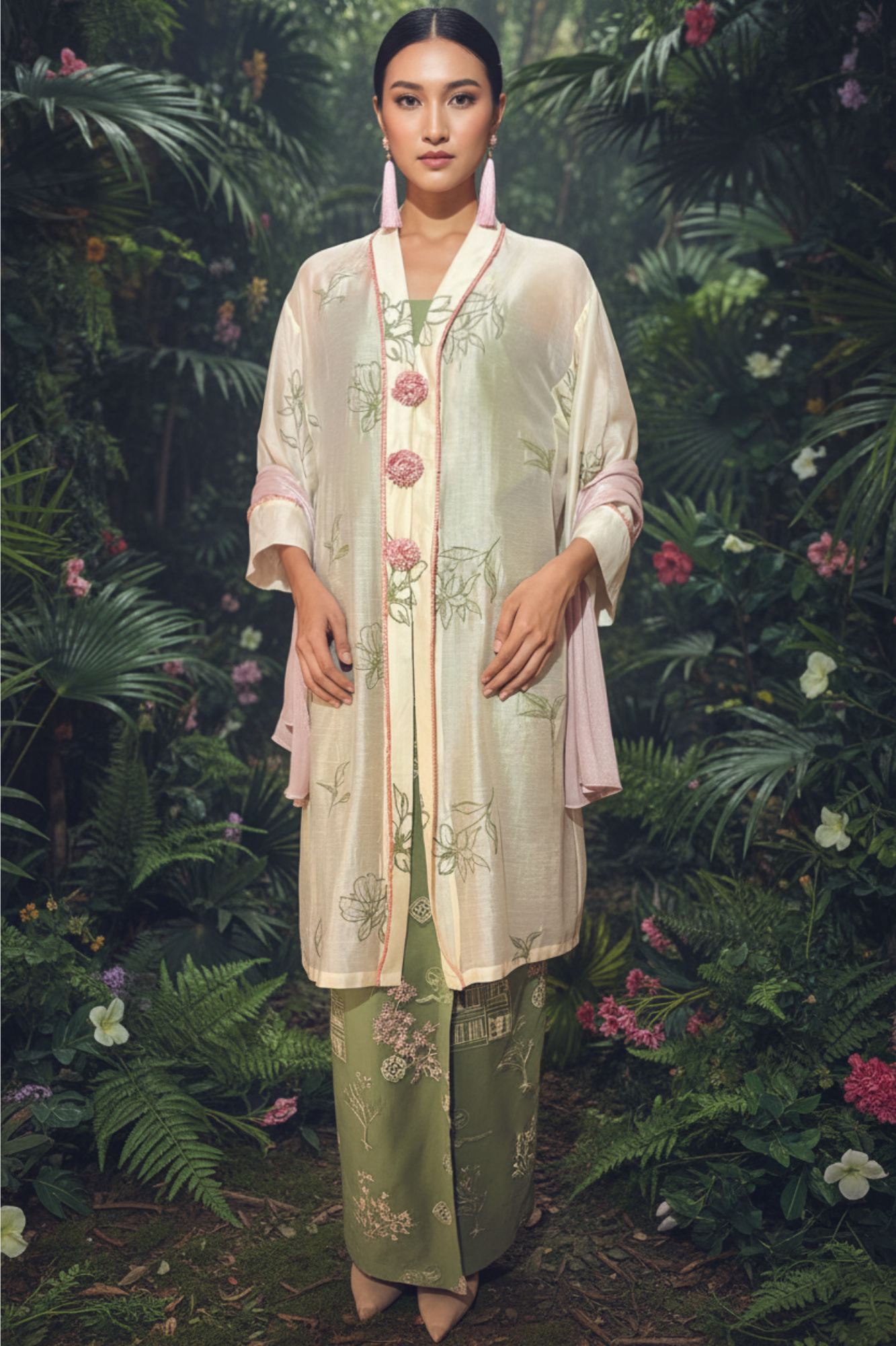 “A classic long kebarung with embroidered fabric detailing complemented by a three-piece embroidered kerongsang-style accent. The look is finished with embroidered tulle skirt, creating a luxurious yet distinctive ensemble.