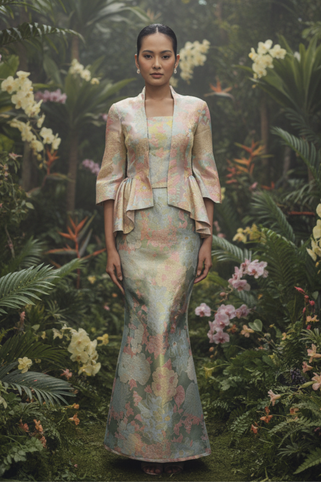 “A luxurious kebaya Kota Bharu inspired crafted in rich brocade, design to exude timeless elegance. The waist is enhanced with a refine lux fabric detailing, subtly sculpting the silhouette while elevating the overall look with a polished, sophisticated finish.