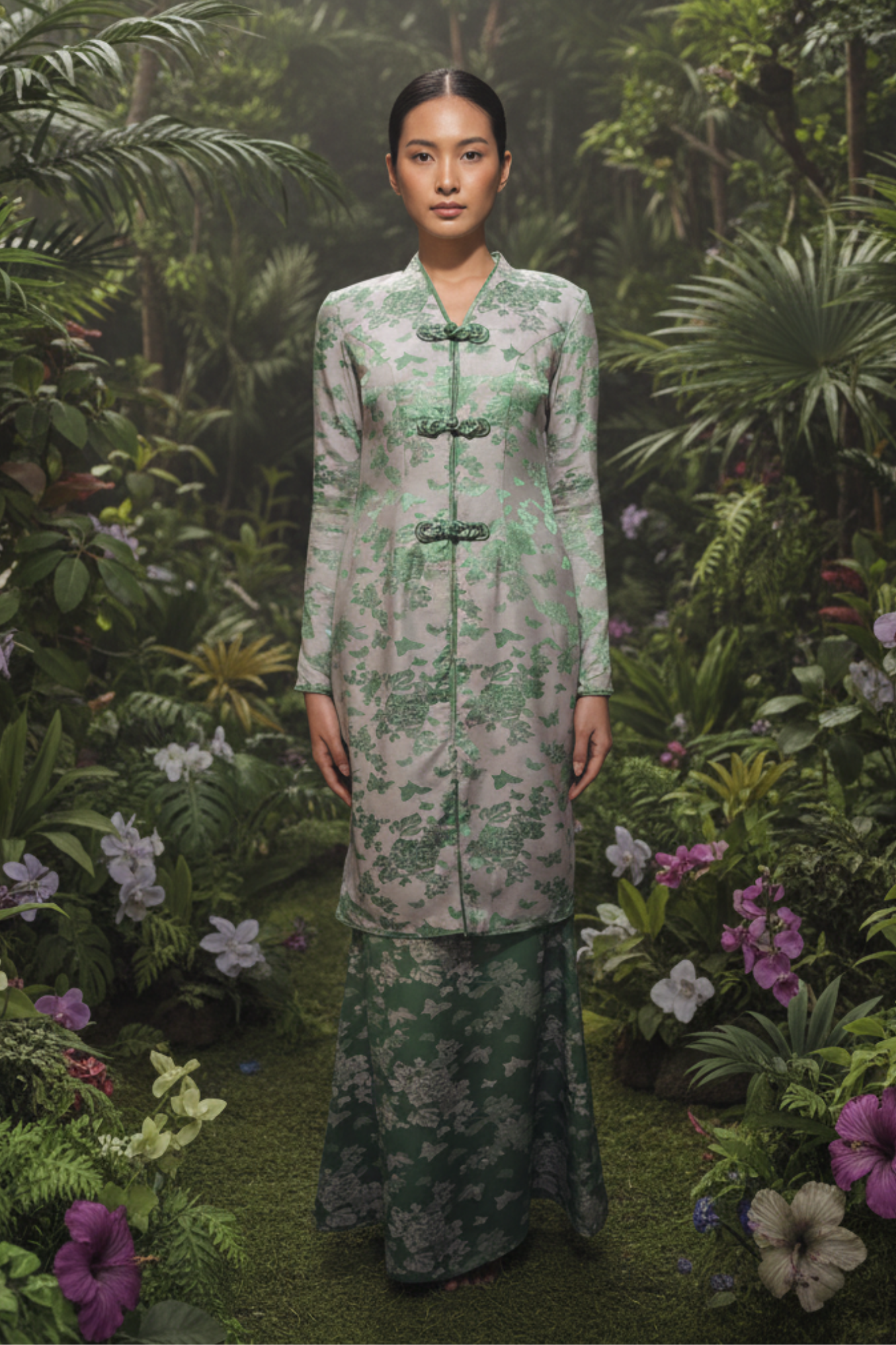 “The Long Kebaya set, crafted in jacquard satin, features delicate detailing along the button-front, symbolizing the thematic essence of Raya Lux 26. Fluid and elegant, this ensemble exudes understated sophistication and luxurious refinement.”
