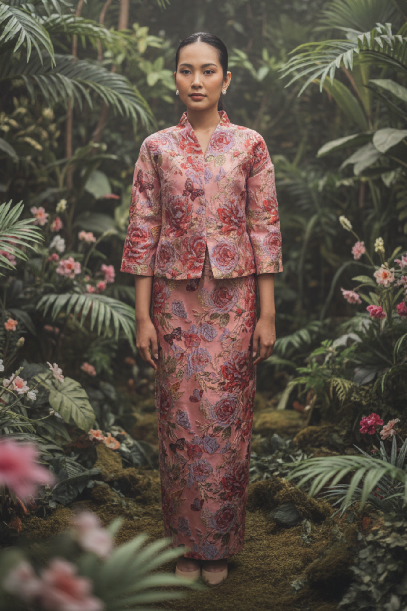 “A modern kebaya crafted in rich brocade, exuding exclusivity and a luxurious Raya Lux 26 presence. Comes with a matching silk camisole, the top now can have option as mini kebaya jacket! The floral-inspired fabrics and carefully chosen colors draw inspiration from the collection’s theme, creating a statement piece that feels both elegant and sophisticated.”