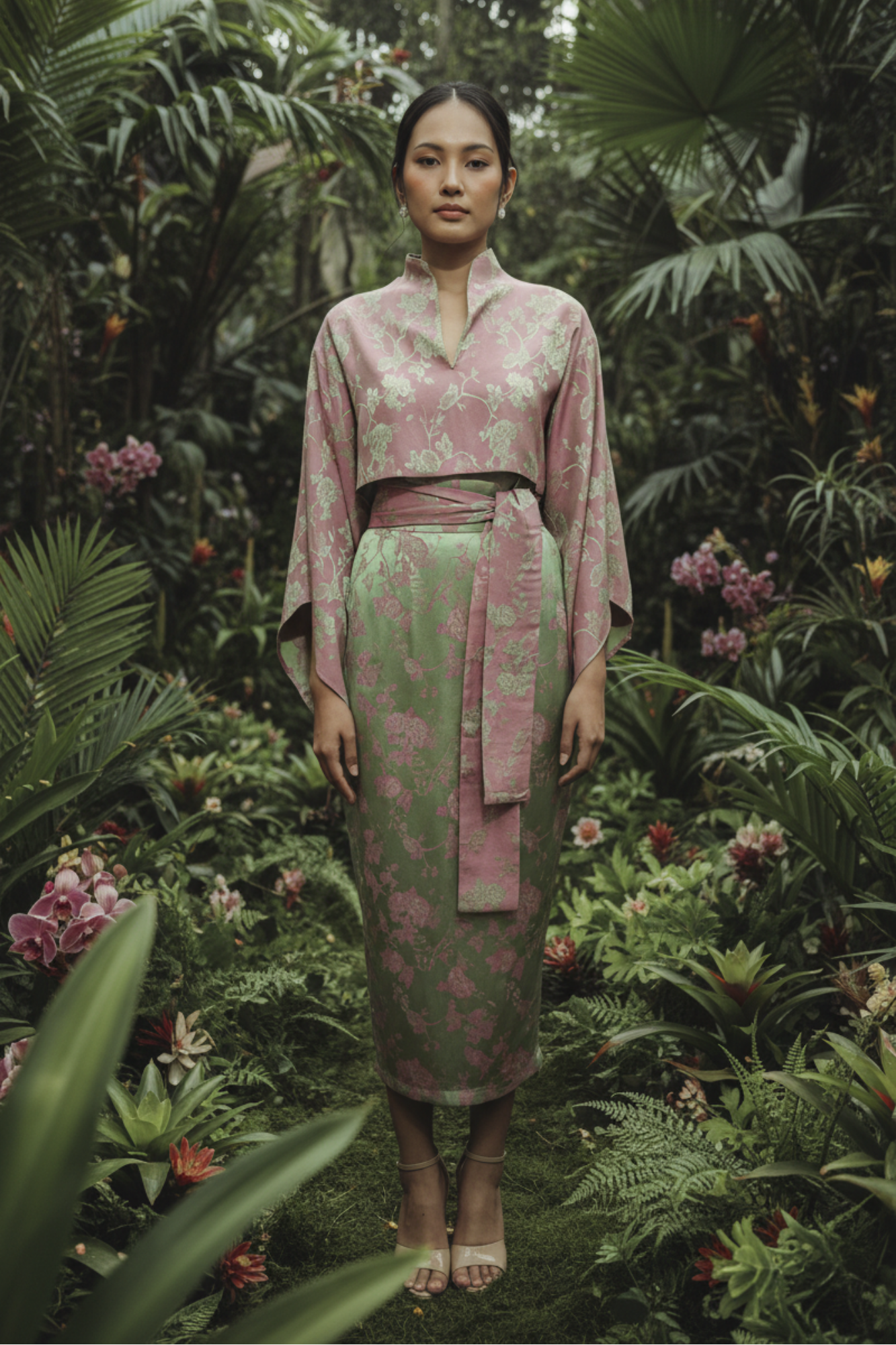 “A modern Raya Lux 26 ensemble featuring dramatic detailing along the sleeves and neckline, paired with a crop-top silhouette. The high-waisted skirt, accented with a coordinating belt, elevates the contemporary look while maintaining subtle Raya elegance. Crafted in jacquard satin, the rich colors reflect the spirit of the collection.”