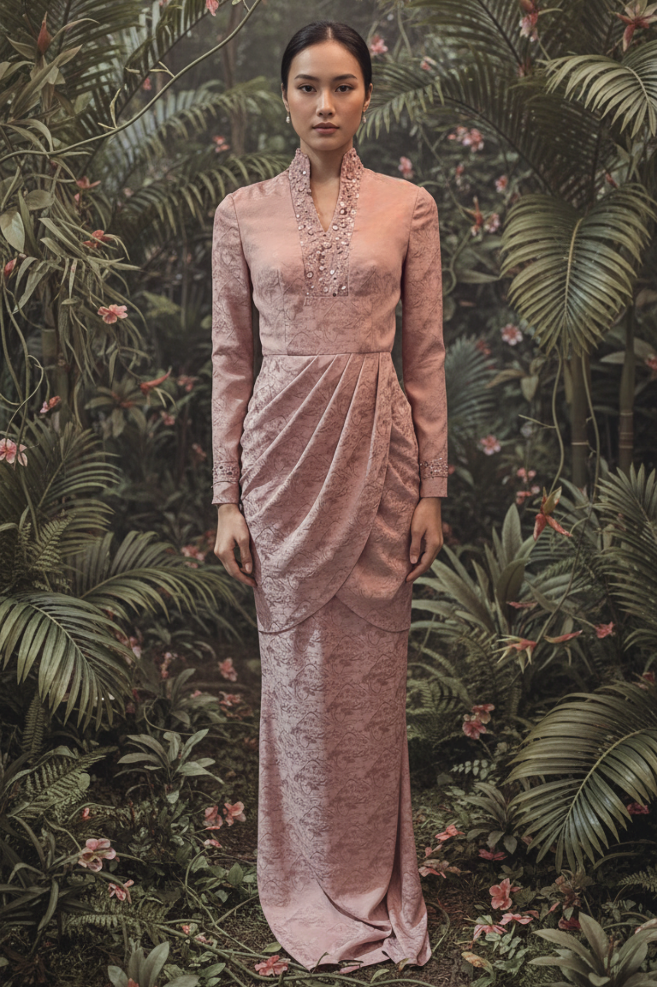 “Modern kurung look, Nayana, in jacquard satin with graceful drape detailing. Beaded accents along the neckline elevate the design, embodying the collection’s luxurious Silk Road inspiration. Sophisticated and striking, it promises an elegant Raya presence.”