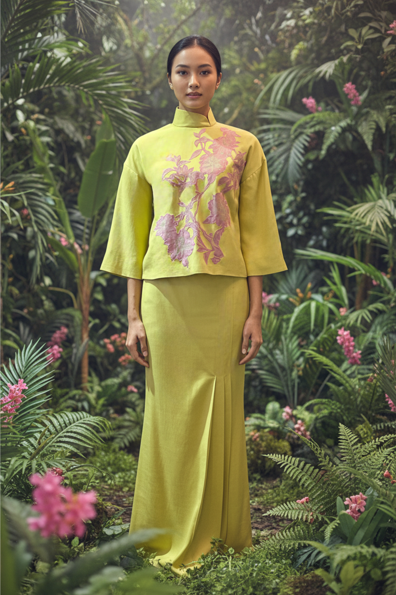 “Crafted for timeless elegance, this cotton-look kurung set showcases intricate embroidery on the top,mandarin collar and paired with a skirt detailed with side pleats for a flowing, graceful silhouette. Luxurious in appearance yet comfortable to wear, it’s a statement Raya look that feels effortlessly elevated”