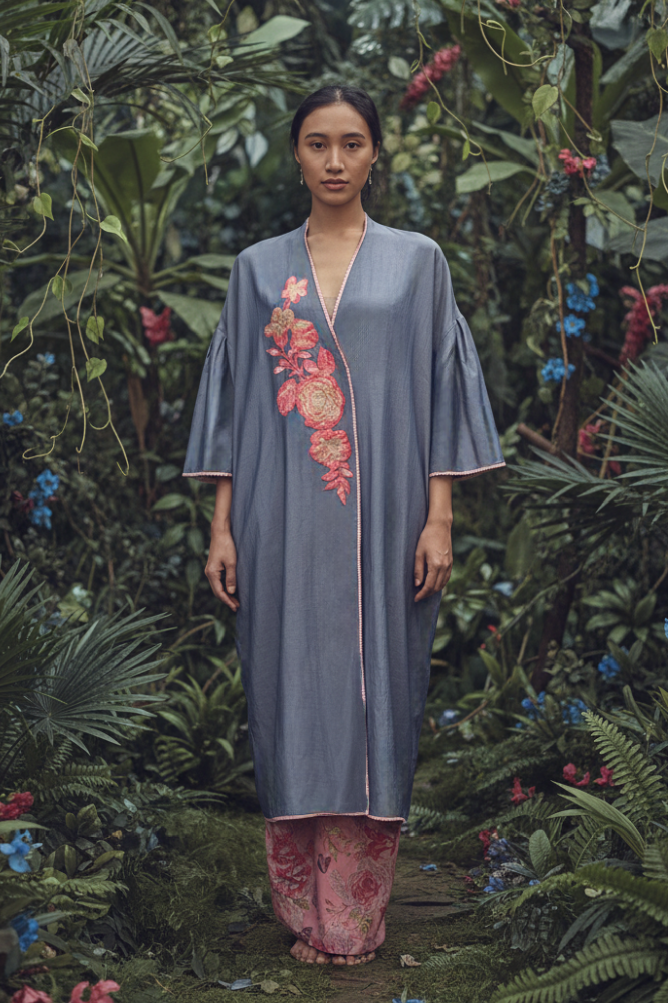 “A classic kebarung with elegant sleeve details and an overlapping top, adorned with embroidered floral embellishments. Paired with a brocade skirt, this ensemble exudes subtle refinement while maintaining a regal, royal-inspired Raya Lux 26 presence.”