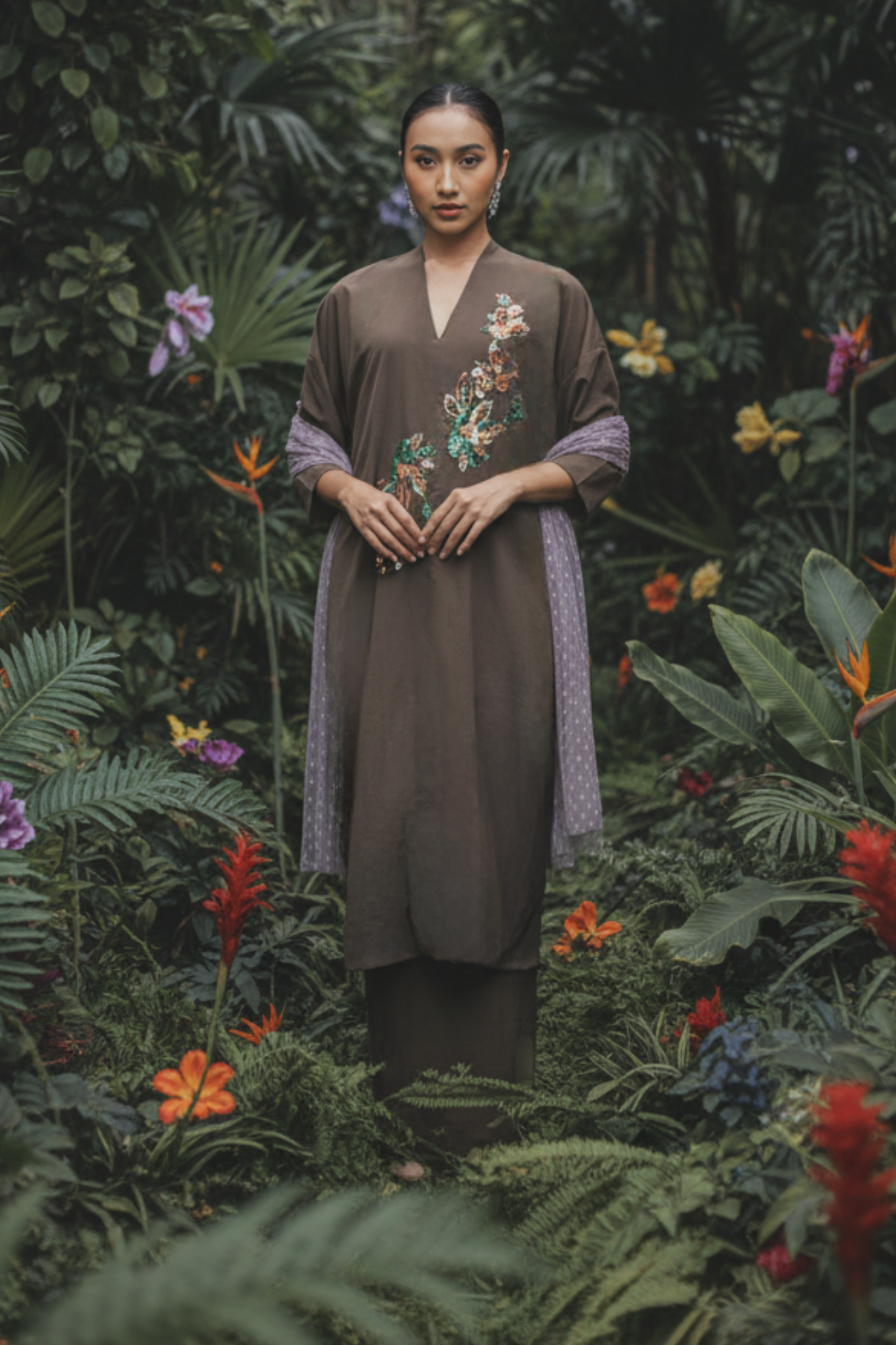 “A timeless kebarung with subtle embroidered detailing, designed to balance simplicity and refinement. The relaxed cut offers ease and comfort, while the elegant silhouette captures the quiet luxury and craftsmanship of the Silk Road journey.”